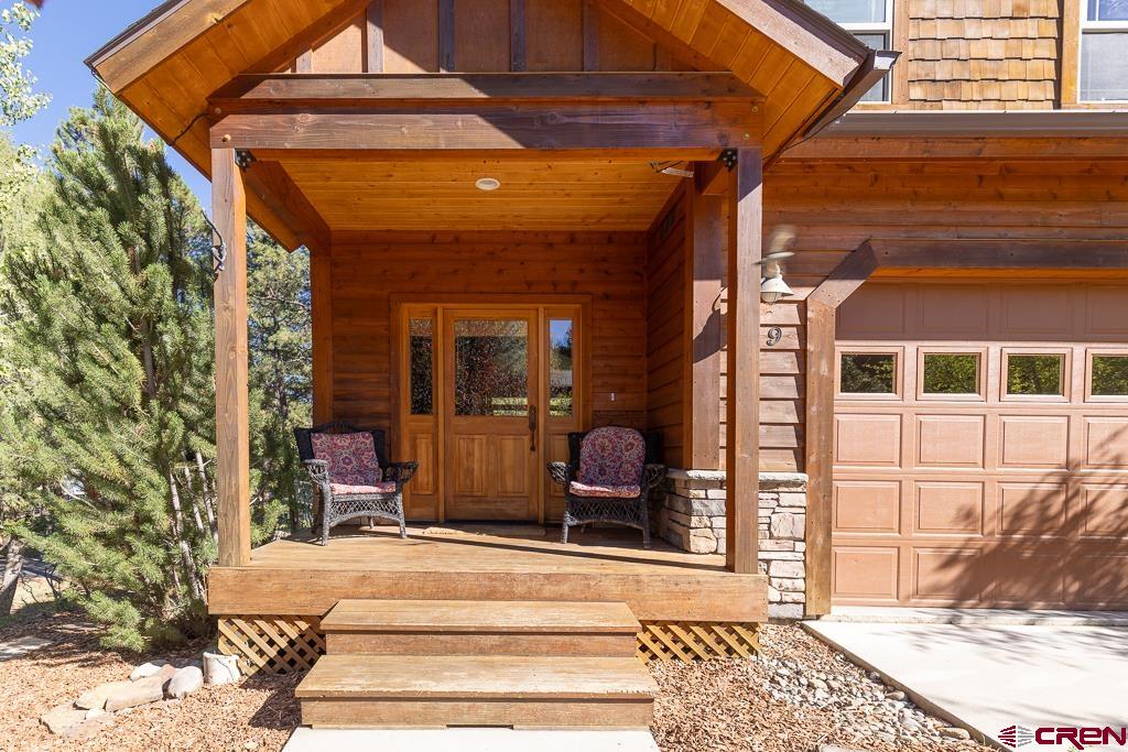 Welcome to this beautifully maintained townhome in the desirable Edgemont Ranch community, just 15 minutes from downtown Durango. Backing to a peaceful greenbelt with sweeping ridge views, this residence offers a rare blend of privacy, comfort, and convenience. The inviting covered front porch opens into a bright, open-concept main level with hardwood floors, abundant natural light, and a gas fireplace framed in stone. An elegant arched wall subtly defines the living space while keeping the flow open between kitchen, dining, and living areas. Step outside to the deck to enjoy your morning coffee or unwind with an evening meal while surrounded by the quiet natural setting. The kitchen features granite tile countertops, Samsung stainless steel appliances, a farmhouse sink, and soft-close cabinetry. A laundry room with utility sink and built-in storage sits just off the kitchen, with direct access to the oversized garage. In-floor radiant heating throughout ensures year-round comfort and efficiency. Upstairs, carpet with plush padding enhances the second level, where custom built-in bookcases line the hallway leading to three bedrooms. The spacious primary suite feels like a private retreat, with vaulted ceilings, abundant light, a walk-in closet, and an en-suite bath complete with dual sinks, a jetted tub/shower, and a private water closet. Two additional bedrooms share a full bath, offering flexible space for guests, family, or a home office. The home has been thoughtfully upgraded over time, including a conversion to natural gas, updated appliances, stained cedar siding, window coverings, a drip irrigation system, and more—making it truly move-in ready. Living in Edgemont Ranch means access to miles of private hiking trails, tennis courts, playgrounds, greenbelts, and fishing rights along the Florida River—all while enjoying paved roads, central utilities, and a welcoming neighborhood just minutes from town.